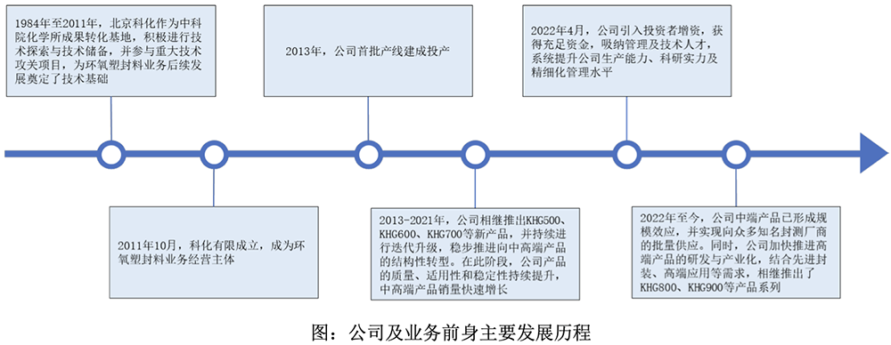 中科科化的前身为科化有限,成立于2011年10月,由北京科化出资设立,从事半导体封装用环氧塑封料的研发及产业化。北京科化成立于1984年,是我国最早的环氧塑封料产业化基地之一。