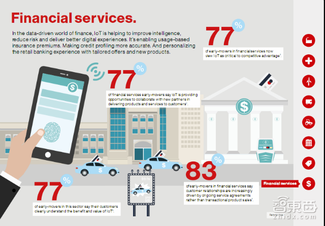 在数据驱动的全球金融环境中,物联网是有助于提高智能化、降低风险并提供更好的数字化体验。它可以用于计算保险费用,用于准确的信贷分析,个性化零售银行业务的经验并提供定制化的新产品。