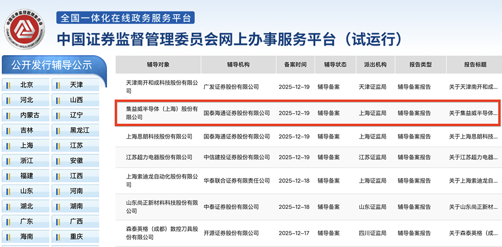 芯东西12月22日报道,12月19日,证监会官网显示,上海模拟芯片公司集益威半导体在上海证监局办理上市辅导备案登记,启动A股IPO进程,辅导机构为国泰海通。