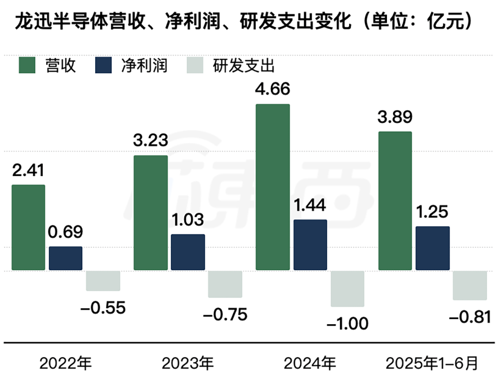 2022年、2023年、2024年、2025年1-6月,龙迅半导体收入分别为2.41亿元、3.23亿元、4.66亿元、3.89亿元,净利润分别为0.69亿元、1.03亿元、1.44亿元、1.25亿元,研发费用分别为0.55亿元、0.75亿元、1.00亿元、0.81亿元。