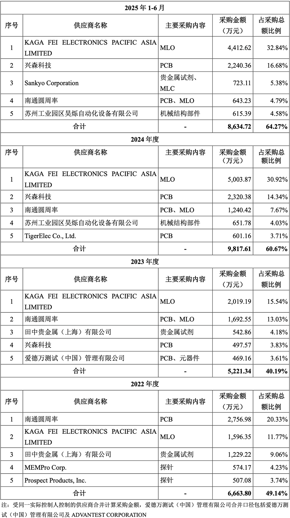 报告期内,强一股份向前五大供应商采购金额占采购总额的比例分别为49.14%、40.19%、60.67%、64.27%,集中度较高,主要是采购探针卡所需的PCB、MLO、贵金属试剂、探针及机械结构部件等;同时,公司设备供应商集中度亦相对较高。