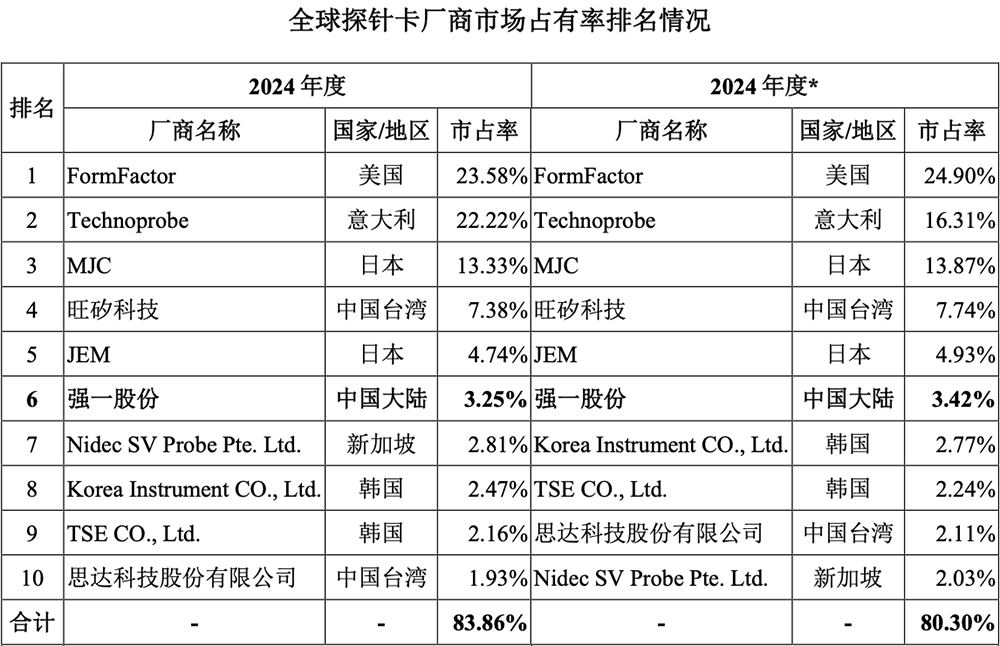 根据公开信息搜集并经整理以及Yole的数据,强一股份在2023年、2024年分别位居全球半导体探针卡行业第九位、第六位,是近年来唯一跻身全球半导体探针卡行业前十大厂商的境内企业。
