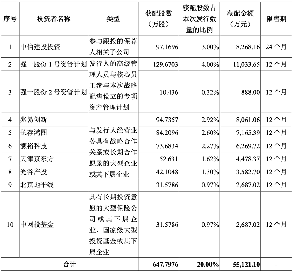 参与其战略配售的投资者包括兆易创新、京东方、地平线、中国互联网投资者基金等。