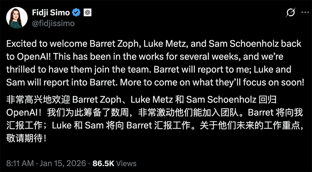 紧接着今早8点,OpenAI应用首席执行官Fidji Simo宣布Barret Zoph、Luke Metz、Sam Schoenholz被挖回OpenAI,Zoph将向Simo汇报工作,Metz和Schoenholz将向Zoph汇报工作。