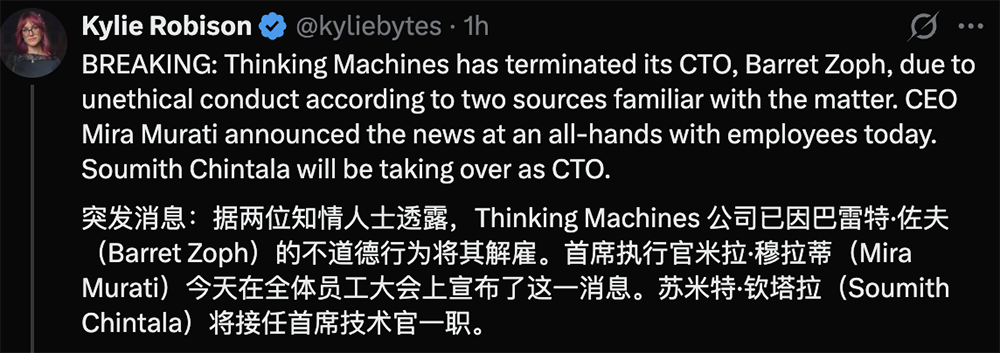 智东西1月15日报道,今早,媒体人Kylie Robison在社交平台X上发文称,据两位知情人士消息,由前OpenAI首席技术官Mira Murati共同创立的知名AI创企Thinking Machines Lab已解雇其首席技术官Barret Zoph,因其“不道德行为”。