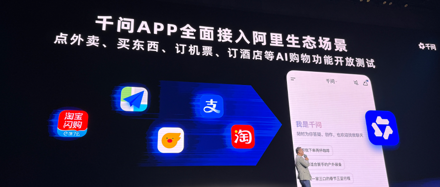 千问App宣布全面接入阿里生态场景,包括淘宝、支付宝、淘宝闪购、飞猪、高德、1688、盒马、优酷、大麦娱乐、阿里健康、菜鸟生态业务组,点外卖、买东西、订机票、订酒店等AI购物功能开放测试。