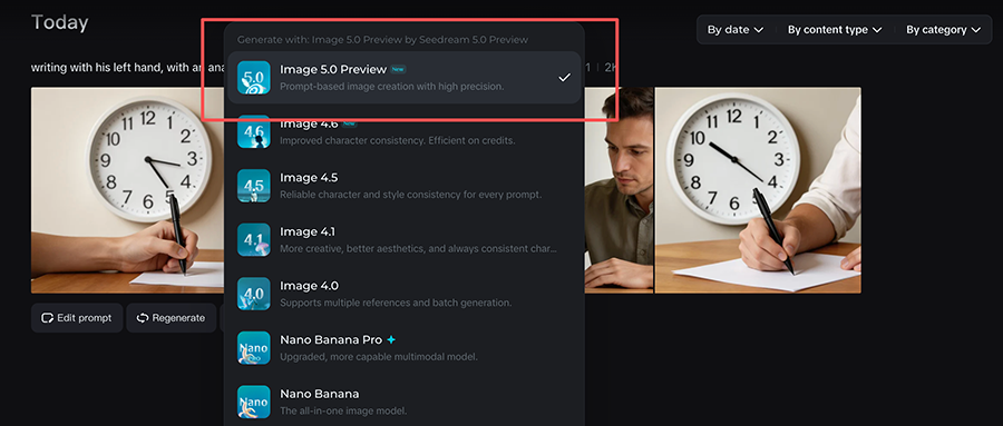 智东西还比较了Seedream 5.0 Preview与Nano Banana Pro的生成效果。一个超难提示词为“生成一个用左手写字的人,背景有一个显示5:25的模拟时钟”,Seedream 5.0 Preview与Nano Banana都失败了,要么是拿笔的手不对,要么是背景的钟表时间不对。