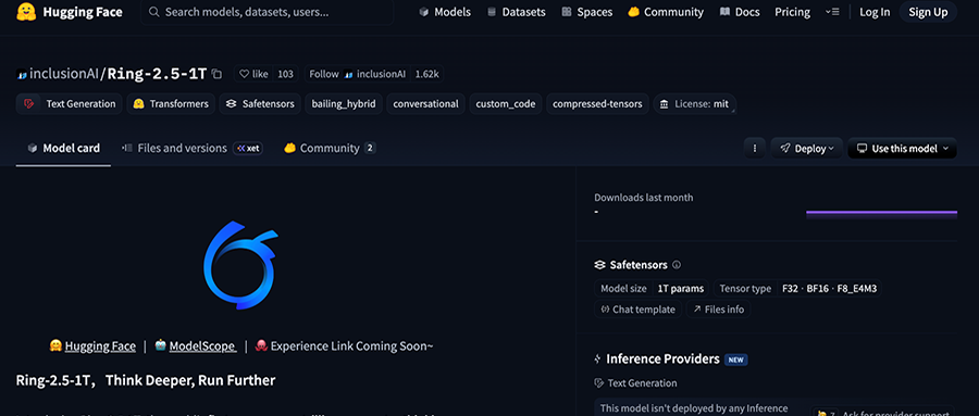 Ring-2.5-1T的模型权重与推理代码已在Hugging Face、ModelScope等主流开源平台发布,官方平台Chat体验页和API服务将在近期上线。