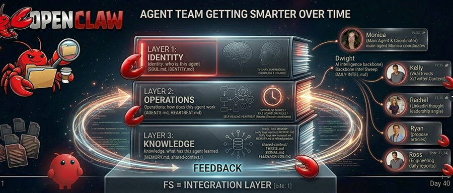 整个系统以Markdown文件为核心,分为身份层、操作层、知识层三层架构。智能体不需要复杂的调度框架、消息队列、数据库,就可以通过Markdown文件系统本身进行整合。