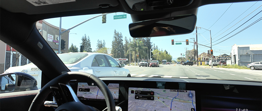 我的试乘路线是从圣何塞Signia酒店附近上车,途径日本城、Willow Glen社区,最终绕回出发点。这条路线经专门设计,尽可能多地展示不同路况,涉及信控路口、四路停车标志、施工路段等复杂场景。