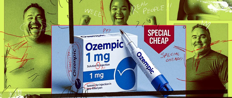 这则广告出现在一篇新闻文章底部,展示了一张明显由AI生成的奥泽匹克药盒图片。这张图片布满了AI痕迹,比如扭曲、无法辨认的字母,还包括一个豆子形状的标识,这与奥泽匹克制造商诺和诺德使用的、带有阿匹斯公牛的标识毫无相似之处。
