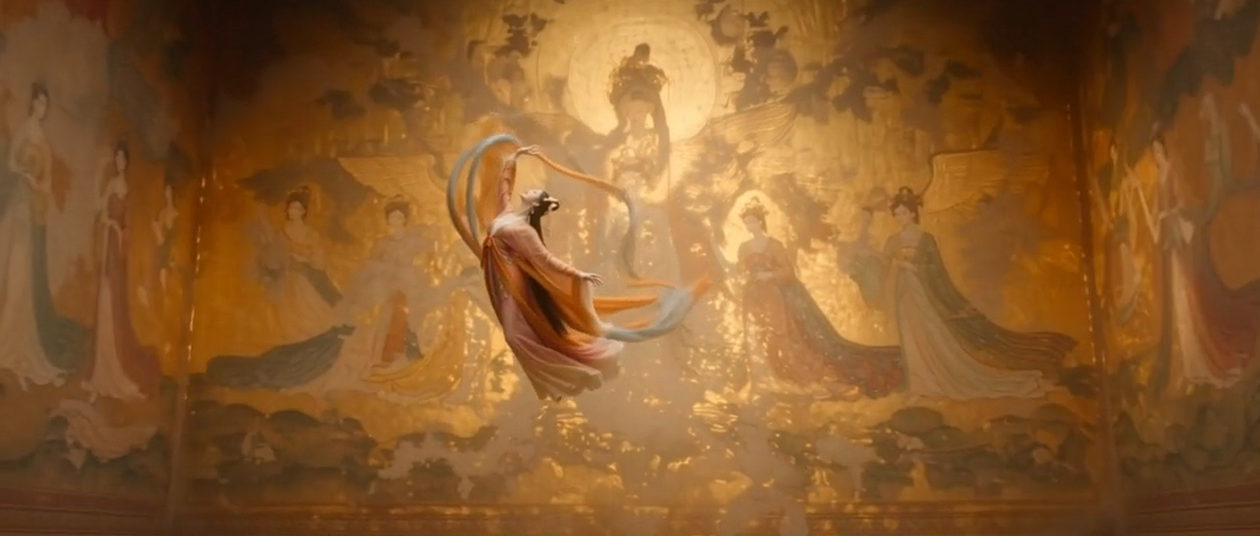 提示词: 敦煌飞天仙女从壁画中破壁而出,五彩丝带自然飘动,背景壁画逐渐从斑驳褪色变为五彩斑斓的原貌。