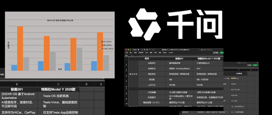 千问在生成柱状图等可视化图表这项功能上表现相当不错,除我自己的测试以外,在下方官方案例中,千问整理了不同大学各个学科的缺考、合格和挂科人数及所占比例,并以此为数据源生成每个大学对应的柱状图,图表非常清晰。