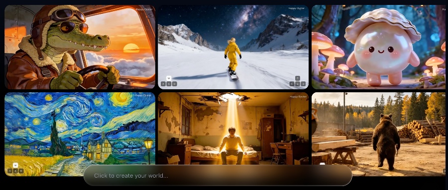 在HappyOyster中,仅凭一行文本或一张图片,用户就可以生成一个完整的物理世界。并且,其生成的并非仅仅是视频片段,而是一个持续运行的物理世界。在这个世界里,光照、重力、角色动作以及场景间的因果关系都保持时间和逻辑上的连续一致。