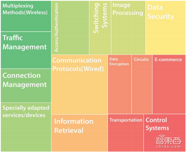 图中方块面积表明该领域专利数量,颜色则表示该领域专利申请活动的热度。颜色越红,表示未来这一领域的专利申请就月火爆;绿色表示未来相关申请会较少;黄色表示中间水平。