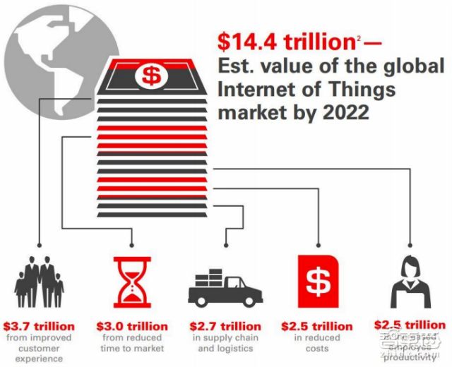 思科的预测是,全球物联网的市场规模在2022年将会达到14.4万亿美元。具体分布则是:3.7万亿美元来自改进用户体验,3万亿美元来自缩短上市时间,2.7万亿美元来自供应链环节和后勤,2.5万亿美元来自缩减开支,2.5万亿美元来自提高员工生产力。