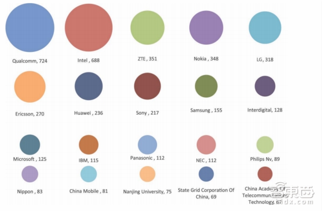 上图给出了专利储备Top20的公司或机构,分别是:高通、英特尔、中兴、诺基亚、LG、爱立信、华为、索尼、三星、InterDigital、微软、IBM、松下、NEC(日本电气公司) 、飞利浦、Nippon、中国移动、南京大学、国家电网以及中国电信科学技术研究院。仅Top20的专利总量就达到了4363件。