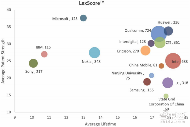 纵轴为前文提到的专利强度,横轴为专利平均年限,圆形面积依然是前文提到的专利申请总量。从中我们能看到华为和中兴的潜力还是很大,通信基础较好的企业向右上角集中。