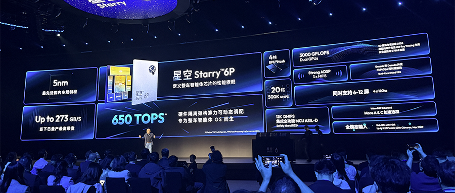 星空Starry 6P采用5nm制程,内置20核CPU(超过500K DMIPS)、3000GFLOPS双GPU、4核BPU Nash,LPDDR5x带宽为273GB/s,峰值算力达650TOPS,支持本地运行端侧大模型,能同时支持6~12屏的显示。