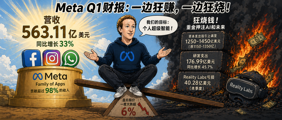 智东西4月30日报道,今天,Meta公布了2026年第一季度财报。季度营收为563.11亿美元(约合人民币3853亿元),同比增长33%,净利润为267.73亿美元(约合人民币1832亿元),同比增长61%,其中超过97.7%的收入来自Family of Apps的广告业务。