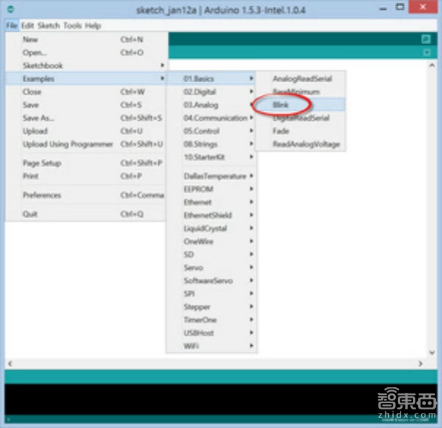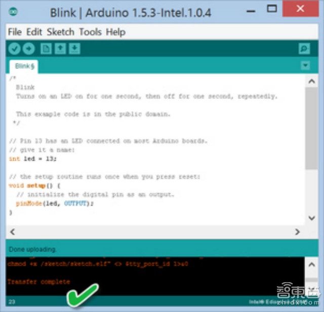在安装好驱动并将Edison开发板连接到电脑上后,就可以使用Arduino针对英特尔的开发环境来开发自己的产品了。《假装是极客》以最简单的Blink闪光程序为例给Edison刷入了第一个程序。从开发环境中,可以看到有很多的例程可以供开发者参考。当然,由于这个开发板已经自带了WiFi模块,用户在开发产品时,也可以通过WiFi实现与开发环境的连接。