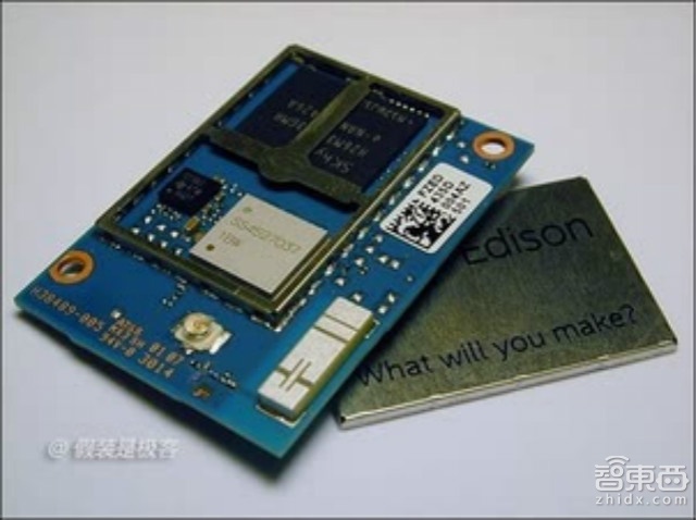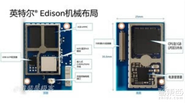 特别要说明的是,Edison模块中的CPU处理器,被集成在了一颗三星的Flash内存中。根据英特尔官方的数据,Edison的处理器单元集成了一颗22纳米双核双线程500MHz的Atom SoC(片上系统)以及一颗32位100MHz的Quark单片机。