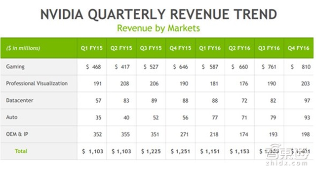 当然,显卡领域也非英伟达一个玩家。黄仁勋的老东家,AMD虽然也是半导体行业的关键玩家,但是在眼下却落得四处挨打的窘境,在CPU方面被英特尔打的毫无还手之力,在GPU领域也是完全招架不住英伟达的强势,濒临破产的边缘。所以,从英伟达发布的2015、2016年的财报上我们也能看出其游戏业务的持续增长。