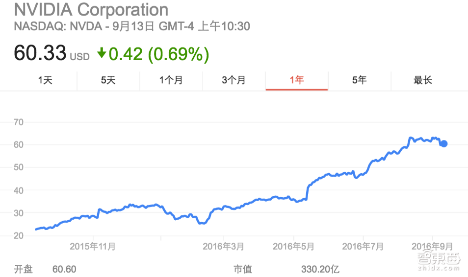 在这满面春风的背后,则是英伟达如飞机起飞般的股价——在过去的一年内,英伟达的股价从每股16美元左右飙升到了每股60元左右(2016年8月12日最高达到63.04美元,9月12日美股收盘价60.75美元),上涨幅度超过接近3倍,登顶标普500成分股涨幅榜首。