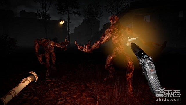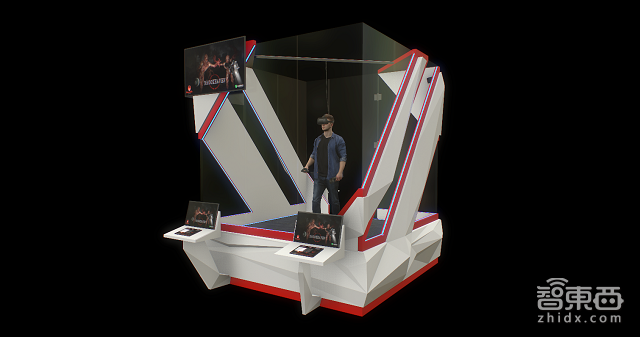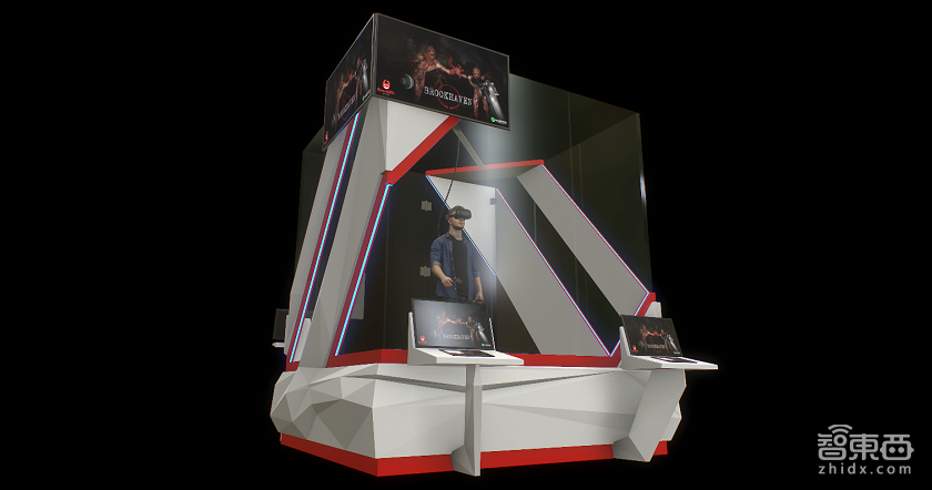 当你走进VRC,先要登上一个台阶,内部和角落都是LED灯,一切都在发光。Vive用线连接到顶部,所以玩的时候不会有线从脚的后方深入地面,你不会绊倒。地板下面有巨大的低音炮,每一声枪响,每一次怪物吼叫,你都会有真切的感受,它有一种4D的感觉。还有雾烟机,它会将雾喷进去。