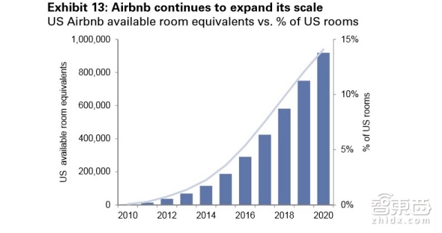 并且,根据高盛旅馆业分析师的预测,Airbnb 2015年占全美房晚供应的份额达到了3.6%,而2020年可能达到14.1%。而2015年传统酒店业房晚供应增长了1.2%,Airbnb的供应削弱了传统酒店业的定价权,且这一趋势在未来只会继续增加。到2020年,传统的美国酒店房晚供应增长率为2.2%,加上Airbnb全行业增长率就是4.9%. 要指出的是,由于Airbnb比传统酒店业的入住率低得多,该公司更多代表了全美房晚供应而非需求。在这个基准场景中,预计Airbnb在2015年占全美房晚需求为1.5%,而2020年占6.5%。