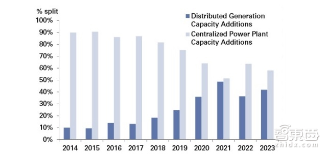 (图为2014年-2023年(预计)中心化生产能力VS分布式生产能力百分比,深色和浅色分别为分布式和中心式产能增量)