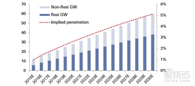 到2030年,我们预计全美的屋顶太阳能渗透率会接近5%,比现在提高大约1个百分点。这意味着那时候至少会有60GW的总的分布式电力产能。