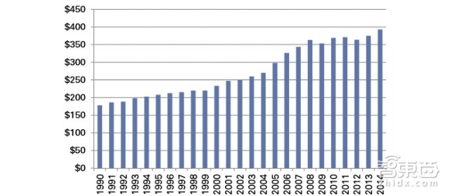 (图为1990年-2014年的美国年度电力销售额,单位:十亿美元)