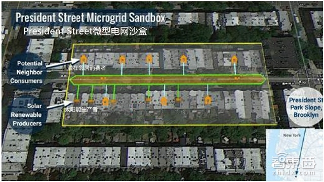区块链可以建立一个去中心化的能源市场。在最具颠覆性的场景中,我们认为结合区块链和通信技术可以促进数百万的参与者之间更安全的交易和支付,为一个去中心化能源市场赋能。简单地说,区块链天然的分布式特征可以让分布式的能源用户无缝地将电力卖给附近的消费者,实现真正的本地化能源生产和消费。这是有可能实现的。在纽约的布鲁克林,一家名为TransActive Grid的创业企业已经建立了这样一个基于区块链技术的P2P能源销售网络,安装了屋顶太阳能的家庭可以向同一条街上没有安装屋顶太阳能的邻居出售他们生产的电力。(见下图)