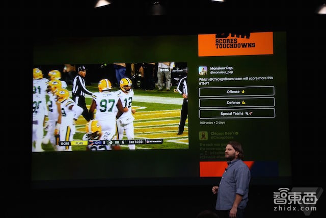 观看橄榄球赛时,Apple TV可让Twitter消息在电视屏幕分屏滚动而增加互动感,网友发的信息同步展示在电视上,用户自己也可以通过iPhone发送消息进行交流。通过这段演示,苹果有意强调电视这块大屏可发掘出更强的互动性,不仅是单向地接受信息,而这些需要靠APP和内容完成。