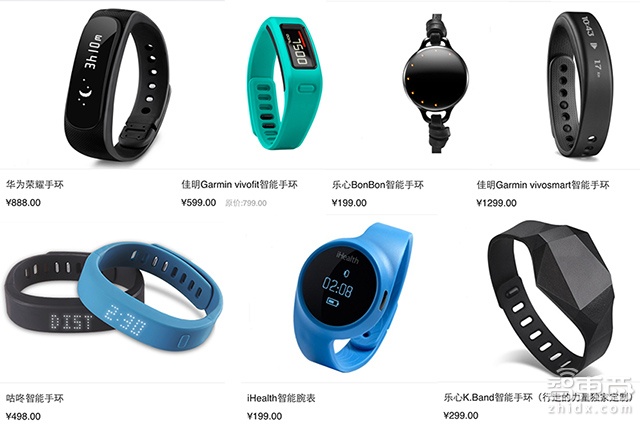 可穿戴类:已经包含了华为、佳明、乐心、咕咚、iHealth、小米这几个品牌在内的9款产品。售价从89块到1299元不等,其实从这几款产品看,整体价格并不便宜,最贵的佳明Garmin vivosmart卖1299元,华为荣耀手环也在888元。