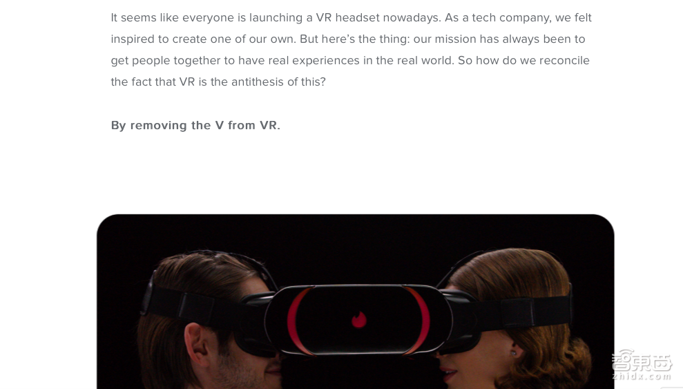 Tinder在官网发文阐述道:“目前,似乎所有人都在做VR头盔(恩,还是有眼力额),作为一个科技公司,我们也受到鼓舞想要创造一款我们自己的VR产品。但是问题是:我们的使命始终是让人们走到一起,在现实世界中获得真实的体验。所以其实VR违背了我们的使命,我们如何调解这一矛盾呢?我们的办法是——去掉虚拟现实中虚拟的部分。让我们在现实相遇吧。”