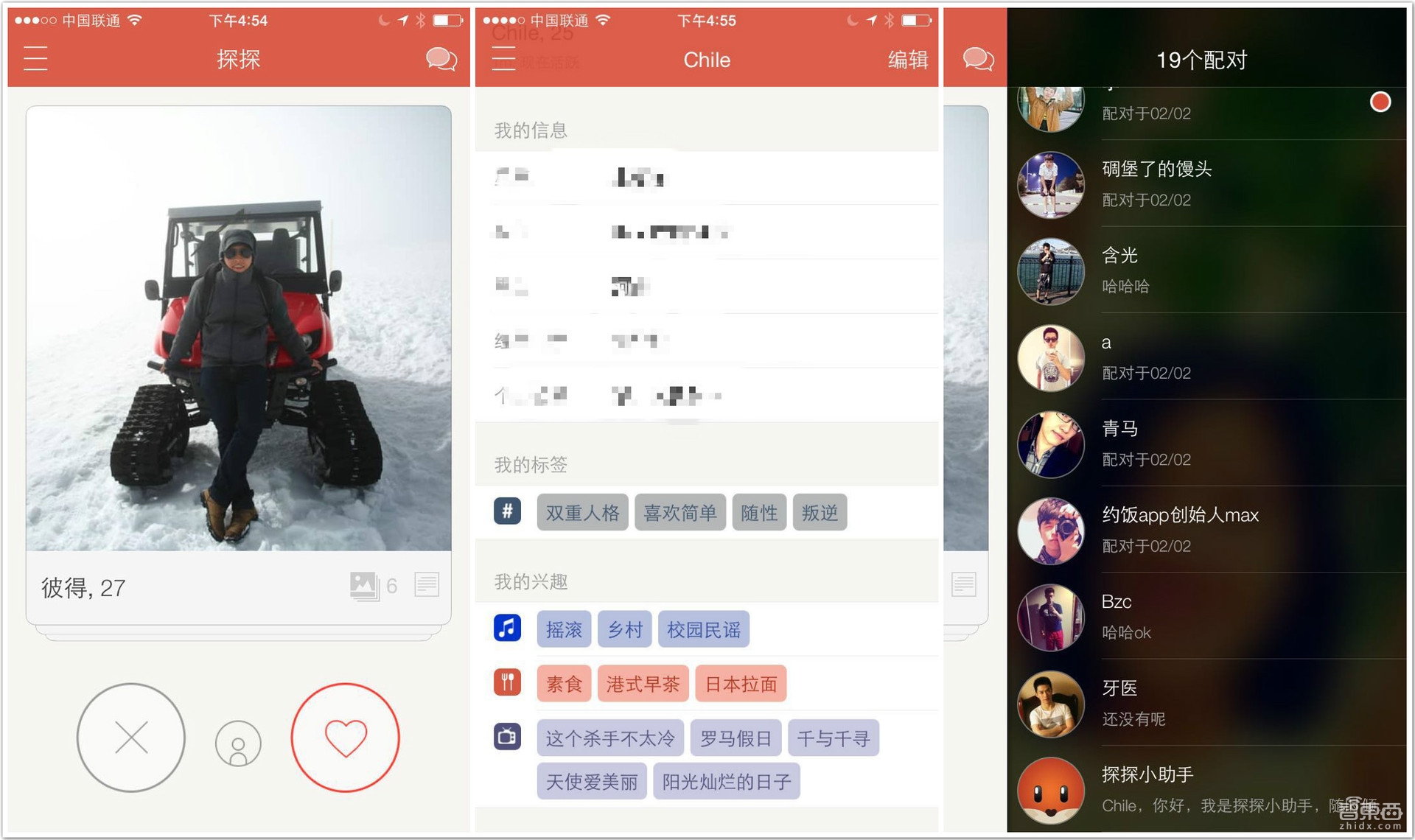 用过探探的人自然也对Tinder很熟悉,不同于Facebook这种熟人社交,Tinder是从线上到线下的陌生人社交。其方式简单直接,甚至可以说有些粗暴。在Tinder上放上照片,写一些个人简介就可以建立账号。然后你可以在上百万用户中找寻你有眼缘的人,“右滑照片”就表示你喜欢某个用户,当这个用户也“右滑”过你的照片时,你们就配对成功,可以展开对话。