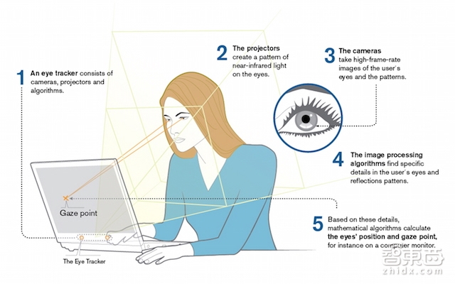 Tobii所使用的技术原理如下:投射近红外光线到用户眼睛里,使用高速眼球摄像头进行记录,并通过算法跟踪用户眼球特征变化,计算出用户的眼球注视点位置及目光移动。