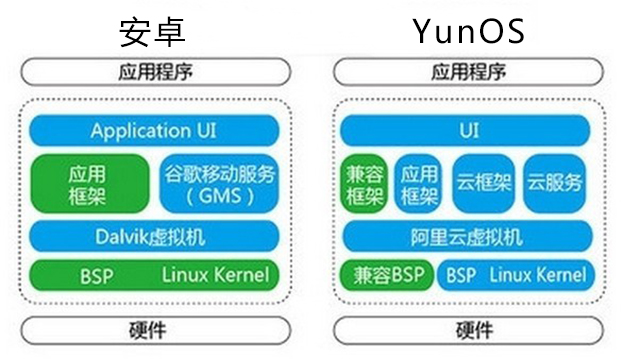 (配图为YunOS与安卓系统的差异,图片来自网络)