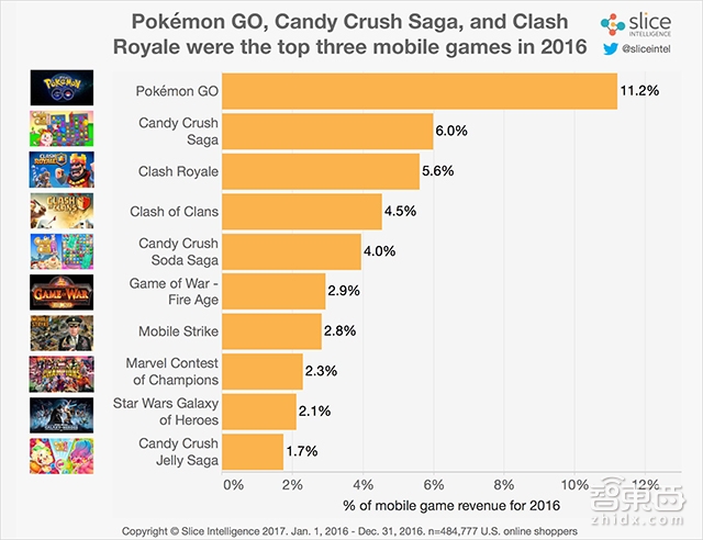 报告显示,Pokemon GO将所有对手远远甩在了身后,其收入占比是第二名Candy Crush的1.86倍。值得注意的是,由于Pokemon GO是2016年才登陆手游市场的,所以它取得这个成绩所用的时间还不到一年。