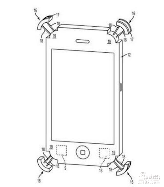 这项专利描述显示,苹果在iPhone机身的四个角设置了带有传感器的弹簧。当传感器识别到iPhone处于急速“自由落体”状态时,就会激活弹簧减震器,从避免手机受损,有点类似汽车的安全囊 。