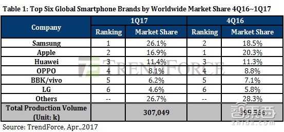 Trenforce还预计三星和其他安卓手机制造商将在接下来的第二季度出现销量下滑的趋势,因为消费者正等待即将上市的iPhone 8。“像三星、LG和华为这样的主要品牌都已经开始发售今年的旗舰手机,但是进入第二季度后市场需求将会保持相对低迷,因为消费者正持币观望传闻中的十周年款iPhone。在下半年到来前,智能手机销售都将十分平淡。”
