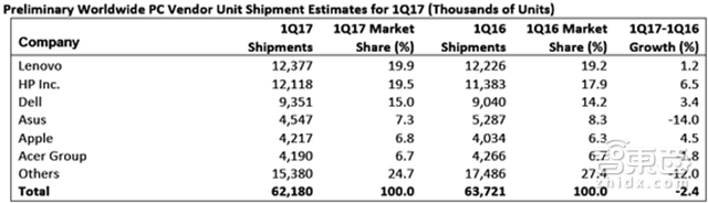 Gartner估计,2017年第一季度全球PC出货量下降了2.4%,出货总量为6220万台。这也是自从2007年以来,PC全球出货量单季度首次降至6300万台以下。在第一季度,全球六大厂商分别是联想、惠普、戴尔、华硕、苹果以及宏碁。正如下表所示,Gartner发现六大厂商中,只有华硕和宏碁PC出货量有所下降。而除了它们外,其余市场出货量下降了12%。