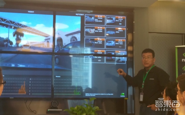在会上的智慧城市的视频demo中,英伟达的李铭博士为我们展示了两端段视频:一段是美国金门大桥上行车拍摄的视频,当4K的视频流传入工作站后,可以实时解读,识别车辆、道路、行人等信息。数据处理过程分别为:输入视频流-解码-利用深度学习找到兴趣区域(如车牌、人脸等)并框选-编码、完成本地处理-输出4K HDMI显示。