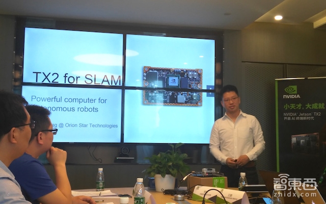 另一位英伟达的合作方,北京猎户星空机器人副总裁蒋超也展示了他们的基于英伟达计算平台的机器人vSLAM应用。他认为,vSLAM是移动机器人中最底层、最核心的部分。以目前的网络状况来说,这种大数据量的计算需要在终端完成,因此Jetson TX2的强大终端计算能力可以很好地帮助机器提升语义地图理解,辅助vSLAM技术发展。
