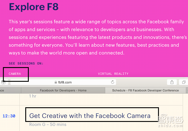 在F8大会开始前,我们可以在官网上看到如下信息:1、本次F8的内容涵盖相机、VR、Messenger等,其中“相机(Camera)”是摆在第一位的;2、在最重磅的开场演讲之后,第一个展示分享环节的名子就叫做“用Facebook相机发挥你的想象力(Get Creative with the Facebook Camera)”