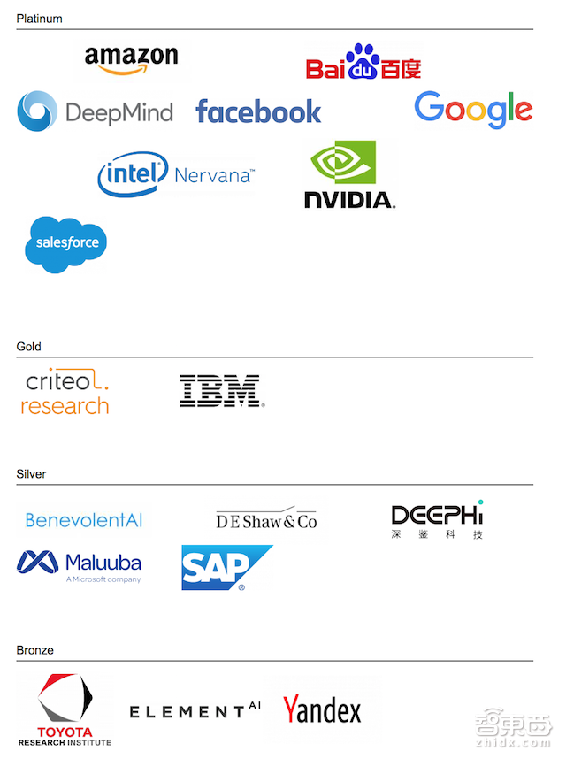 除了百度、谷歌、亚马逊之外,今年的白金赞助商还有DeepMind、Facebook、英特尔、英伟达、Salesforce。去年的白金赞助商只有4个,今年多达8个,猛增了一倍之多,可见各家企业对深度学习及这场大会的重视程度。值得一提的,国内创企深鉴科技也在赞助商的名单上,其联合创始人韩松有两篇论文入选。