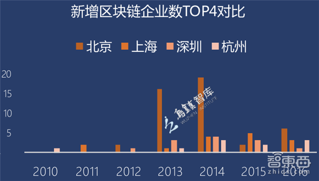 从创业时间节点来看,区块链企业数量仍在不断增长,其中2014年单年度新增区块链企业数量最多。2013年和2014年,北京涌现出大量区块链企业;近两年杭州在新增企业数量方面缩小了与京沪深之间的差距,并于2016年超过深圳。