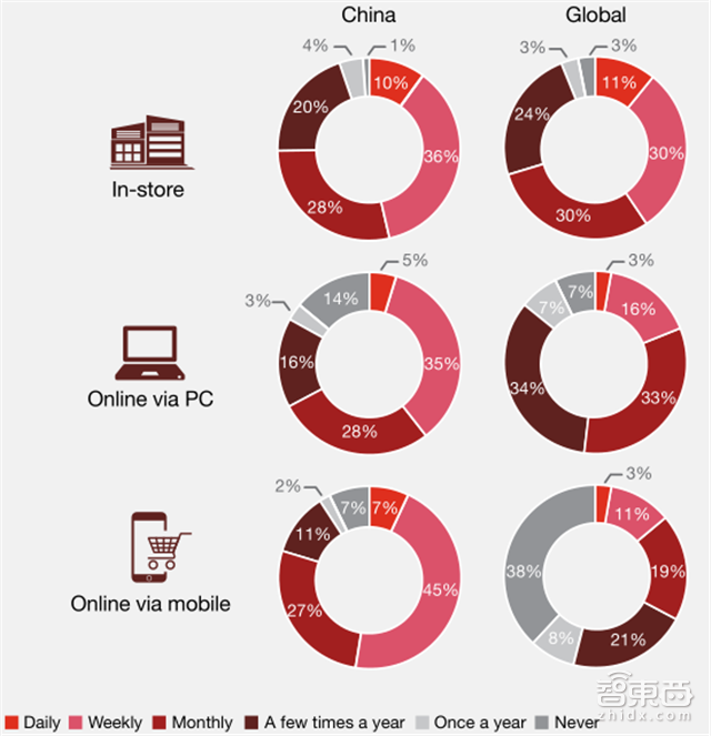 与从同时,调研显示,约52%的中国消费者每周或每天通过移动设备或智能手机购物,相比之下,这一数字在全球仅达到14%。此外,41%的中国消费者通过社交平台获取促销信息,这一比例在全球为34%。
